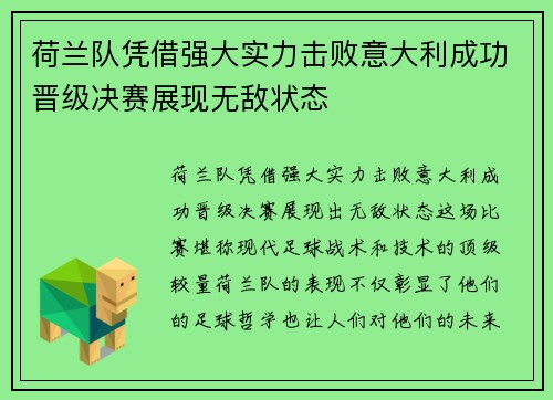荷兰队凭借强大实力击败意大利,成功晋级决...